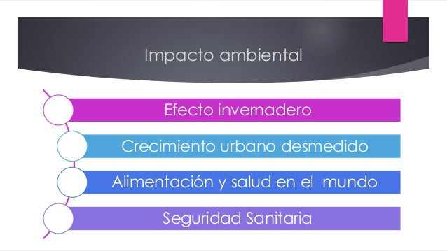35. 35. Impacto ambiental Efecto invernadero Crecimiento urbano desmedido Alimentación y salud en el mundo Seguridad Sanitaria