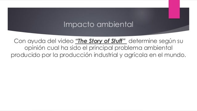 36. 36. Impacto ambiental Con ayuda del video “The Story of Stuff” determine según su opinión cual ha sido el principal problema ambiental producido por la producción industrial y agrícola en el mundo.