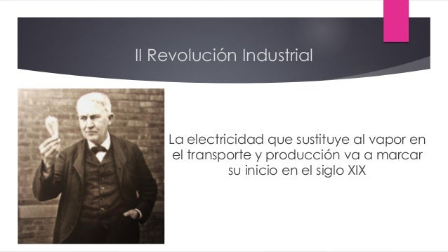 9. 9. II Revolución Industrial La electricidad que sustituye al vapor en el transporte y producción va a marcar su inicio en el siglo XIX