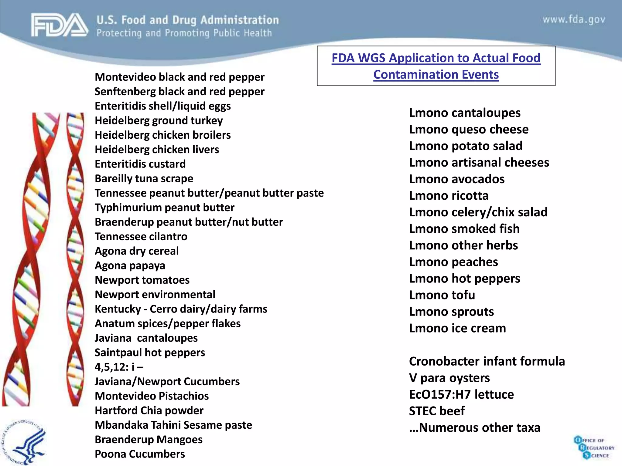 2. 2. Montevideo black and red pepper Senftenberg black and red pepper Enteritidis shell/liquid eggs Heidelberg ground turkey Heidelberg chicken broilers Heidelberg chicken livers Enteritidis custard Bareilly tuna scrape Tennessee peanut butter/peanut butter paste Typhimurium peanut butter Braenderup peanut butter/nut butter Tennessee cilantro Agona dry cereal Agona papaya Newport tomatoes Newport environmental Kentucky - Cerro dairy/dairy farms Anatum spices/pepper flakes Javiana cantaloupes Saintpaul hot peppers 4,5,12: i – Javiana/Newport Cucumbers Montevideo Pistachios Hartford Chia powder Mbandaka Tahini Sesame paste Braenderup Mangoes Poona Cucumbers Lmono cantaloupes Lmono queso cheese Lmono potato salad Lmono artisanal cheeses Lmono avocados Lmono ricotta Lmono celery/chix salad Lmono smoked fish Lmono other herbs Lmono peaches Lmono hot peppers Lmono tofu Lmono sprouts Lmono ice cream Cronobacter infant formula V para oysters EcO157:H7 lettuce STEC beef …Numerous other taxa FDA WGS Application to Actual Food Contamination Events