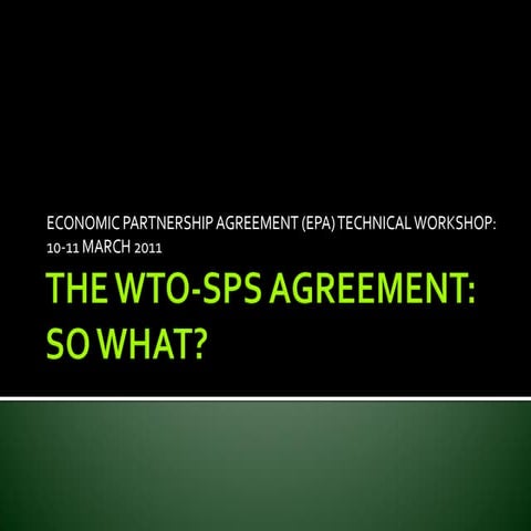 6. 6. SPS : WTO: TBT and SPS measures Protection of people and animals from risks arising from supplements, contaminants, toxins or disease-causing organisms in food, beverages, animal feed. Protection and animals and plants from pests and diseases Protection of human health and safety or animal and plant life National security; Prevention of deceptive practices; Environmental protection TBTObjectives Protection of human life and health from risks arising from diseases transmitted by animals, plants or products made of them