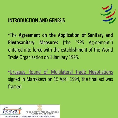 2. 2. 2 Fundamental WTO regulations in the areas of technical regulations and SPS measures 1. During the Uruguay Round (1986-94) the following mandatory for use documents were prepared and adopted: Agreement on Technical Barriers to Trade (TBT); Agreement on the Application of Sanitary and Phytosanitary Measures (SPS). Соглашение по применению санитарных и фитосанитарных мер (СФС). 2. Agricultural products covered by both Agreements on SPS and TBT measures. 3. In accordance with item 1.5. TBT Agreement the provisions of this Agreement shall not apply to SPS measures. A part of SPS measures are included in the technical regulations of the EAEC for agricultural and food products, therefore the technical regulation of the sphere of agricultural products and application of SPS measures in the framework of the EAEC is appropriate to consider together.