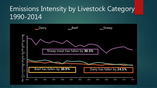 3. 3. Emissions Intensity by Livestock Category 1990-2014 0 5 10 15 20 25 30 35 1990 1992 1994 1996 1998 2000 2002 2004 2006 2008 2010 2012 2014 KgCO2eemissionsperkgofmilksolidormeat Dairy Beef Sheep Sheep meat has fallen by 30.5% Beef has fallen by 30.9% Dairy has fallen by 24.5%