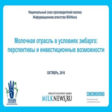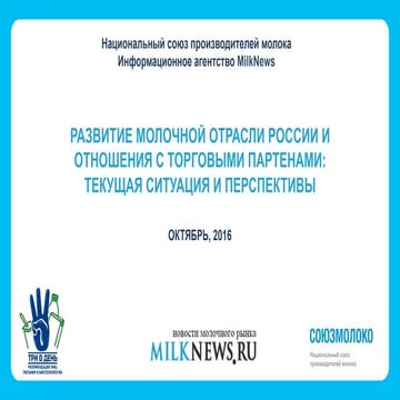 8. 8. 6 Исходя из поставленных задач к 2020 году необходимо выйти на устойчивую конструкцию экспорта по принципу «треть-треть-треть» обеспечить распределение экспортных поставок между тремя рынками Евразийского экономического союза, Европейского союза, стран «дальней дуги» ЭКСПОРТ МОЛОКОПРОДУКТОВ В 2020 ГОДУ – 5 845 тыс. тонн 141 % к 2016 году масло животное 108 тыс. тонн 128 % сыры 188 тыс. тонн 119 % сухое обезжиренное молоко 160 тыс. тонн 144 % Задачи по диверсификации экспорта молочной продукции до 2020 года сухое цельное молоко 65 тыс. тонн в 2,3 раза сухая сыворотка 78 тыс. тонн 117 %