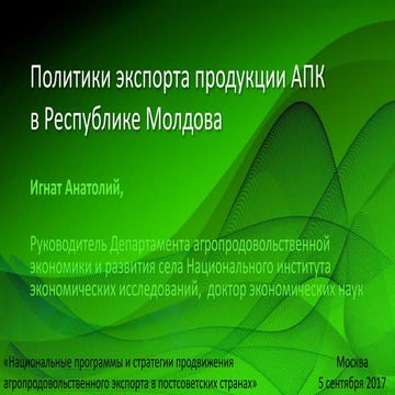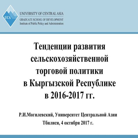 1. 1. Ежегодное заседание Группы Экспертов по вопросам сельскохозяйственной торговли в Европе и Центральной Азии 4 октября 2017 г. Тбилиси, Грузия РЕСПУБЛИКА КАЗАХСТАН: ОБЗОР АГРОПРОДОВОЛЬСТВЕННОЙ ТОРГОВОЙ ПОЛИТИКИ 2016-2017 гг. Адеми Ерасылова, кандидат экономических наук старший научный сотрудник, КазНИИ экономики АПК и развития сельских территорий