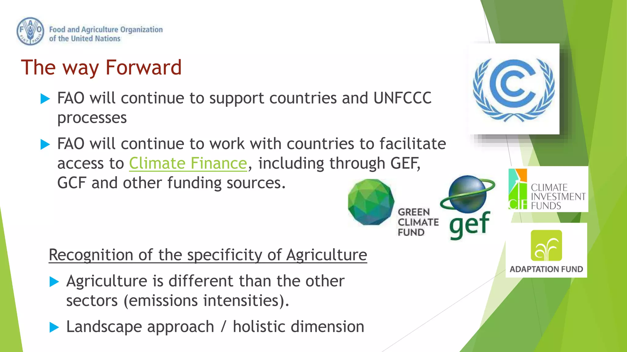 10. 10. The way Forward  FAO will continue to support countries and UNFCCC processes  FAO will continue to work with countries to facilitate access to Climate Finance, including through GEF, GCF and other funding sources. Recognition of the specificity of Agriculture  Agriculture is different than the other sectors (emissions intensities).  Landscape approach / holistic dimension
