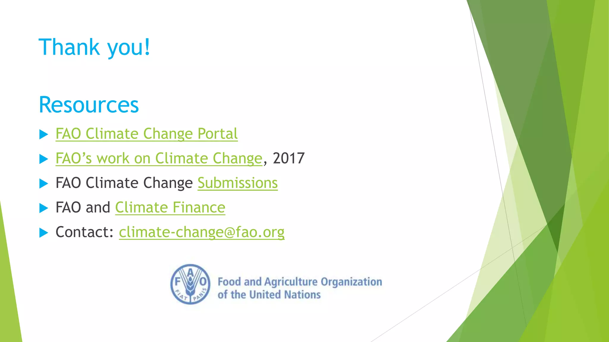 11. 11. Thank you! Resources  FAO Climate Change Portal  FAO’s work on Climate Change, 2017  FAO Climate Change Submissions  FAO and Climate Finance  Contact: climate-change@fao.org