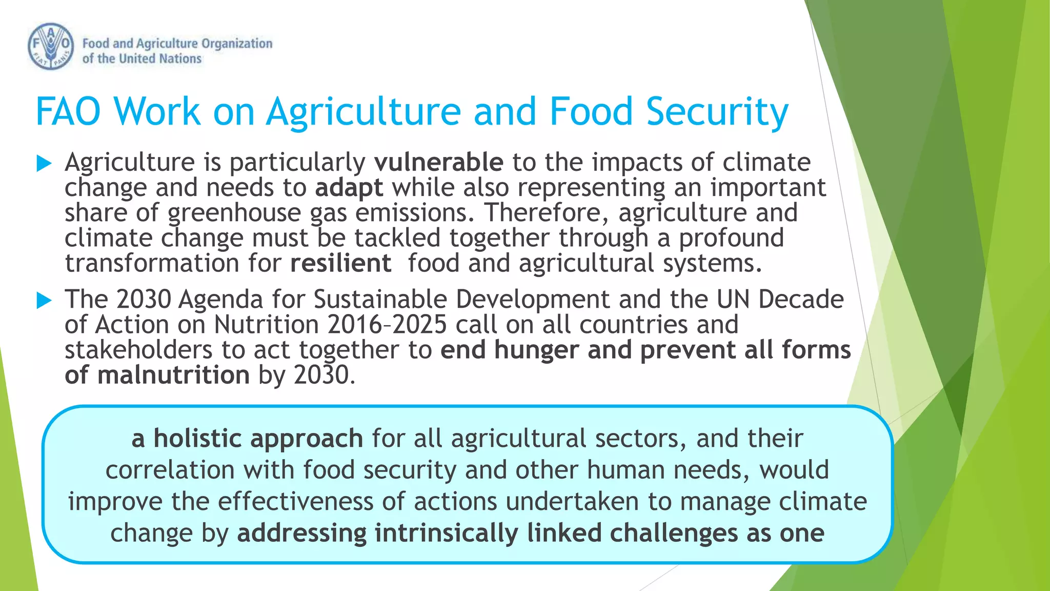 2. 2. FAO Work on Agriculture and Food Security  Agriculture is particularly vulnerable to the impacts of climate change and needs to adapt while also representing an important share of greenhouse gas emissions. Therefore, agriculture and climate change must be tackled together through a profound transformation for resilient food and agricultural systems.  The 2030 Agenda for Sustainable Development and the UN Decade of Action on Nutrition 2016–2025 call on all countries and stakeholders to act together to end hunger and prevent all forms of malnutrition by 2030. a holistic approach for all agricultural sectors, and their correlation with food security and other human needs, would improve the effectiveness of actions undertaken to manage climate change by addressing intrinsically linked challenges as one
