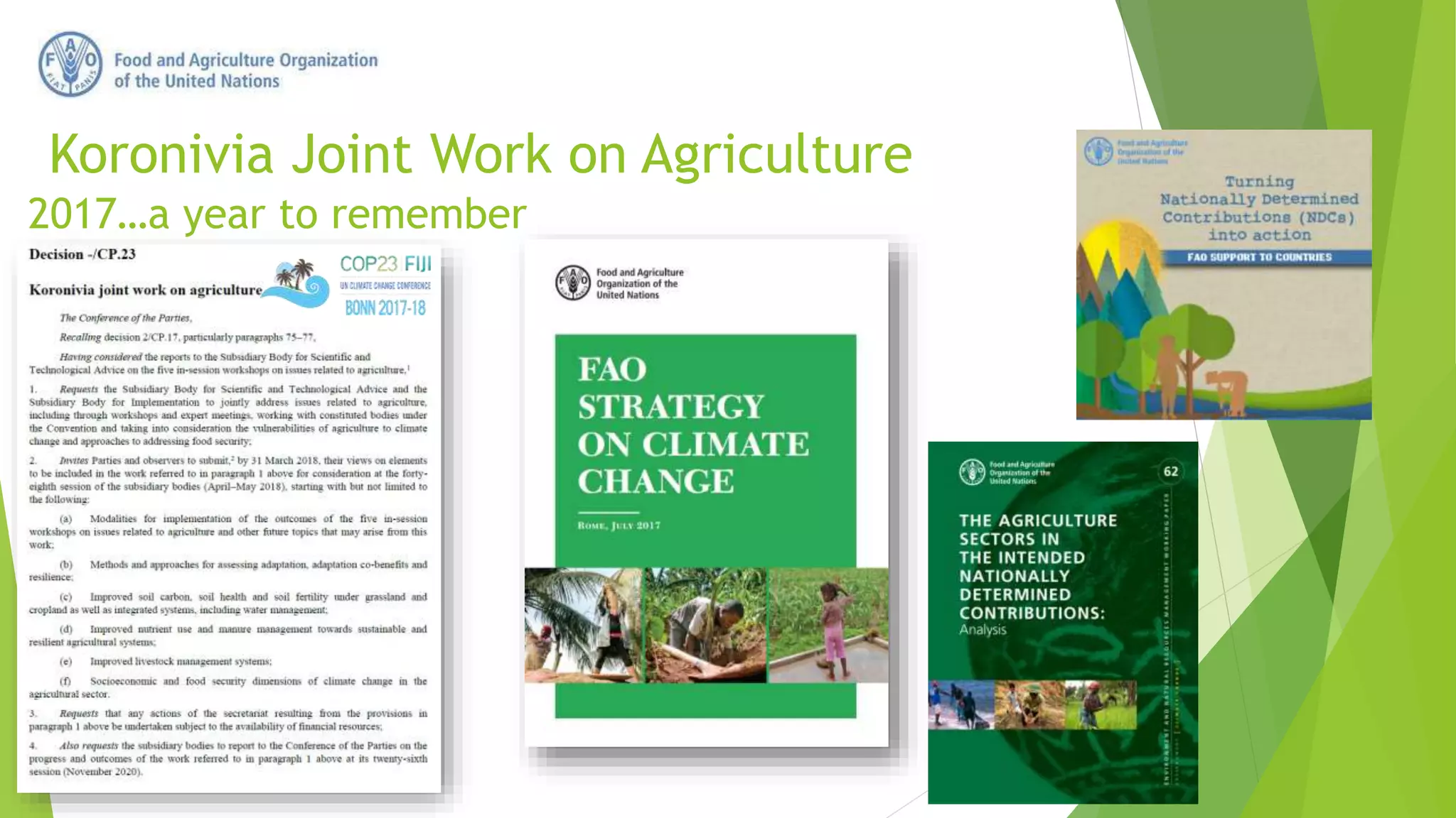 • I am pleased to present FAO perspective on the Koronivia decision. But as you can i,magine in 5 minutes I will only able to propose an overview and I will not be able to cover all details. I apologize in advance for that!