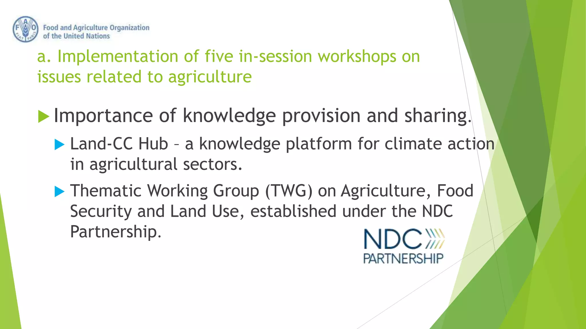 4. 4. a. Implementation of five in-session workshops on issues related to agriculture  Importance of knowledge provision and sharing.  Land-CC Hub – a knowledge platform for climate action in agricultural sectors.  Thematic Working Group (TWG) on Agriculture, Food Security and Land Use, established under the NDC Partnership.