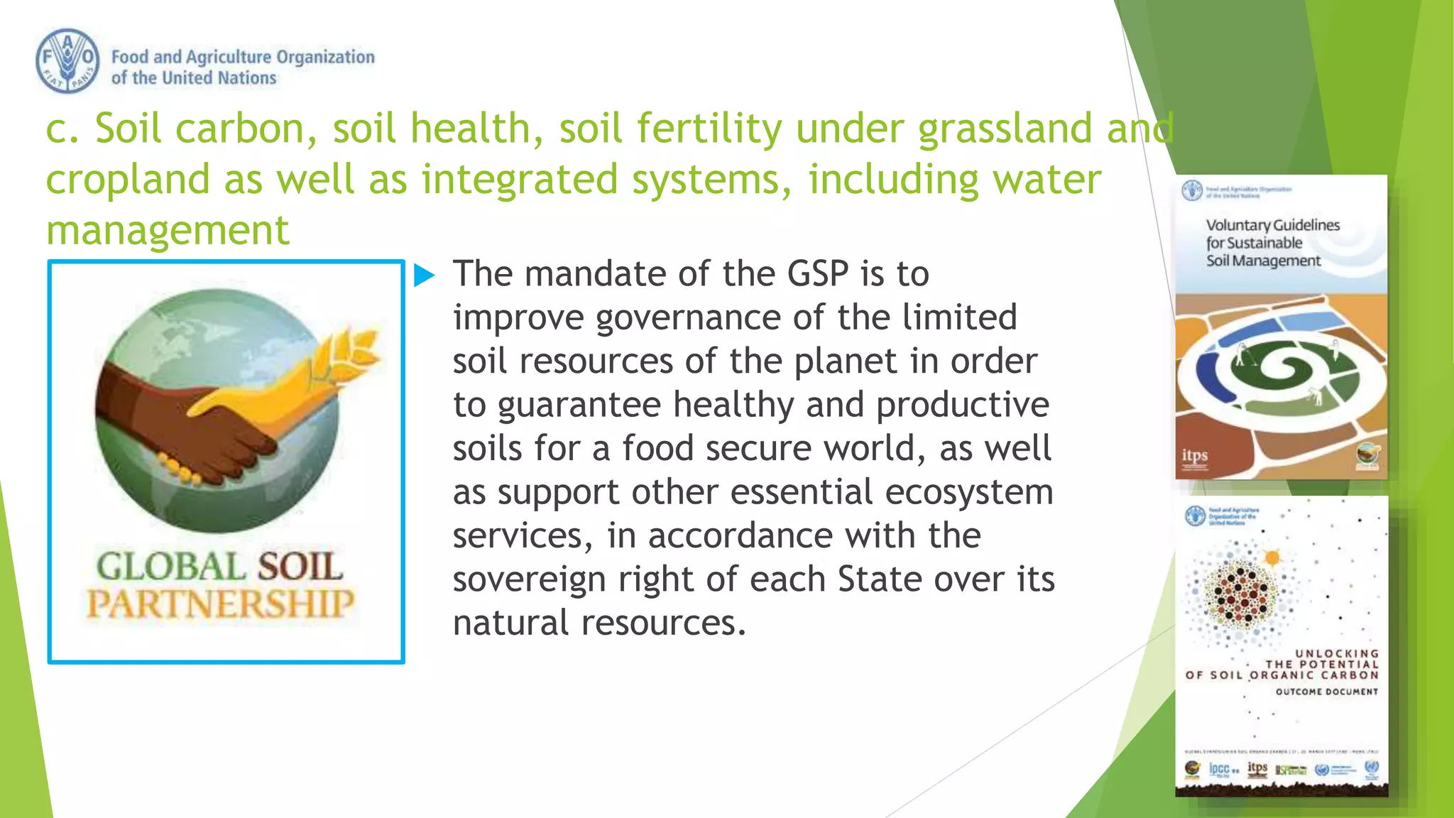 5. 5. c. Soil carbon, soil health, soil fertility under grassland and cropland as well as integrated systems, including water management  The mandate of the GSP is to improve governance of the limited soil resources of the planet in order to guarantee healthy and productive soils for a food secure world, as well as support other essential ecosystem services, in accordance with the sovereign right of each State over its natural resources.
