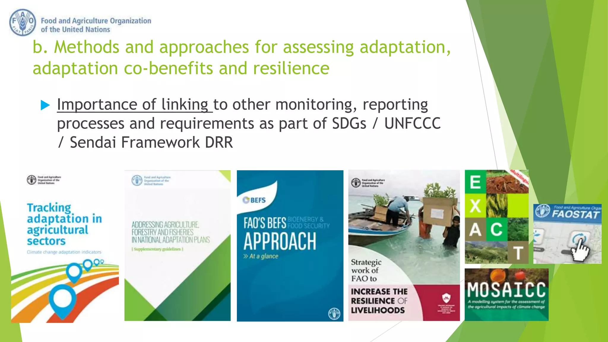 Developing innovative, user-friendly tools and methods for assessing adaptation, adaptation benefits and resilience. Among others, these include Tracking Adaptation in Agriculture Sectors (TAAS), Bioenergy and Food Security Approach, Agriculture Stress Index System, EX-Ante Carbon balance tool and FAOSTAT;