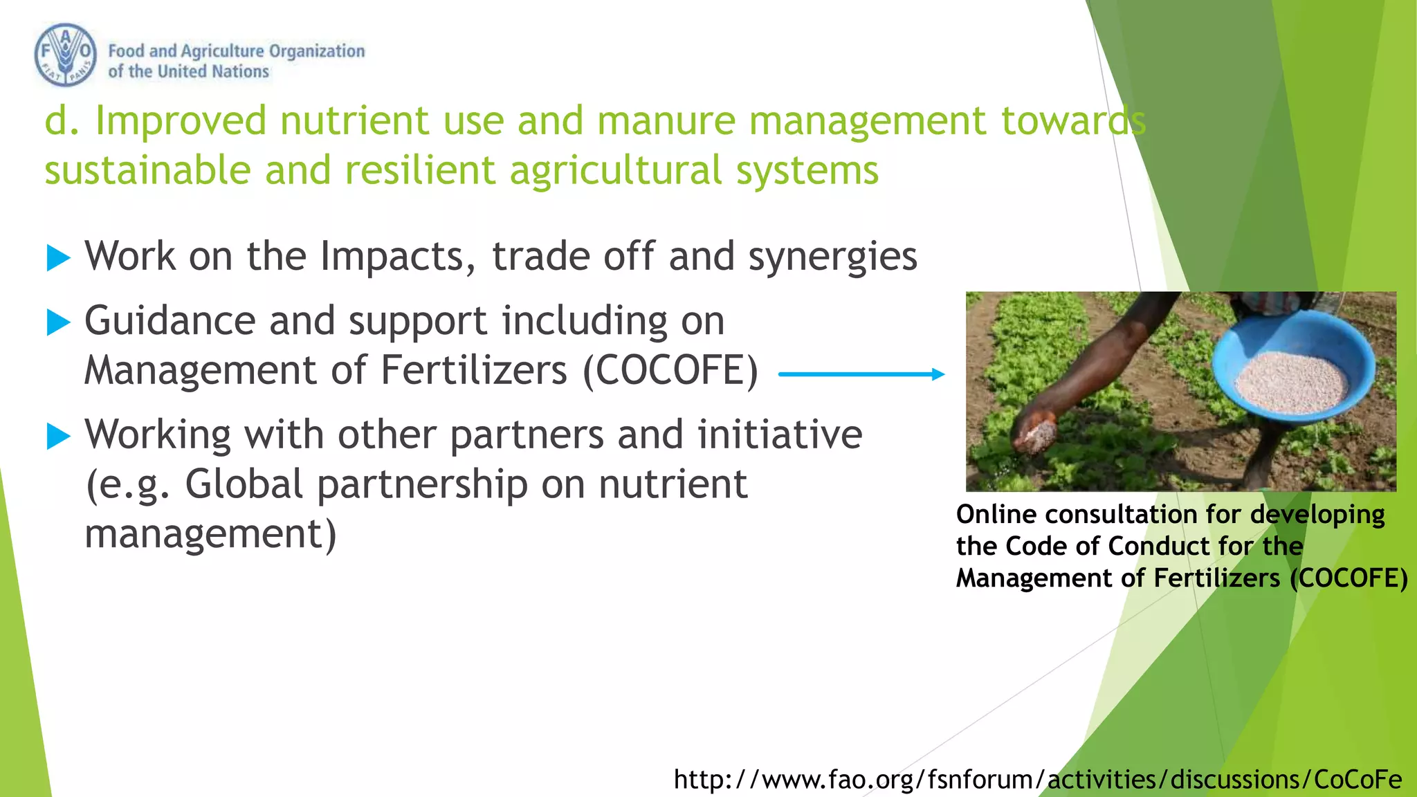7. 7. d. Improved nutrient use and manure management towards sustainable and resilient agricultural systems  Work on the Impacts, trade off and synergies  Guidance and support including on Management of Fertilizers (COCOFE)  Working with other partners and initiative (e.g. Global partnership on nutrient management) Online consultation for developing the Code of Conduct for the Management of Fertilizers (COCOFE) http://www.fao.org/fsnforum/activities/discussions/CoCoFe