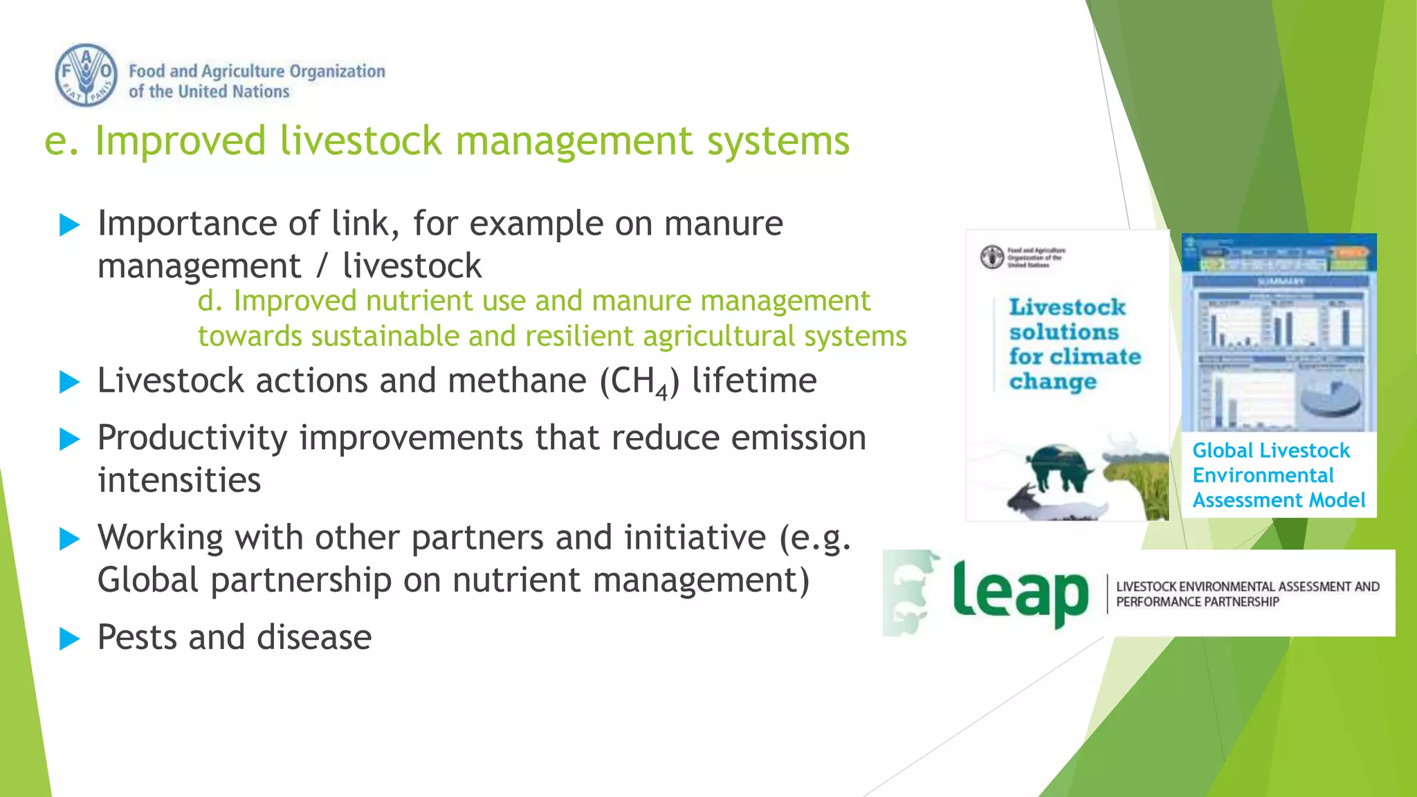 8. 8.  Importance of link, for example on manure management / livestock  Livestock actions and methane (CH4) lifetime  Productivity improvements that reduce emission intensities  Working with other partners and initiative (e.g. Global partnership on nutrient management)  Pests and disease e. Improved livestock management systems Global Livestock Environmental Assessment Model d. Improved nutrient use and manure management towards sustainable and resilient agricultural systems