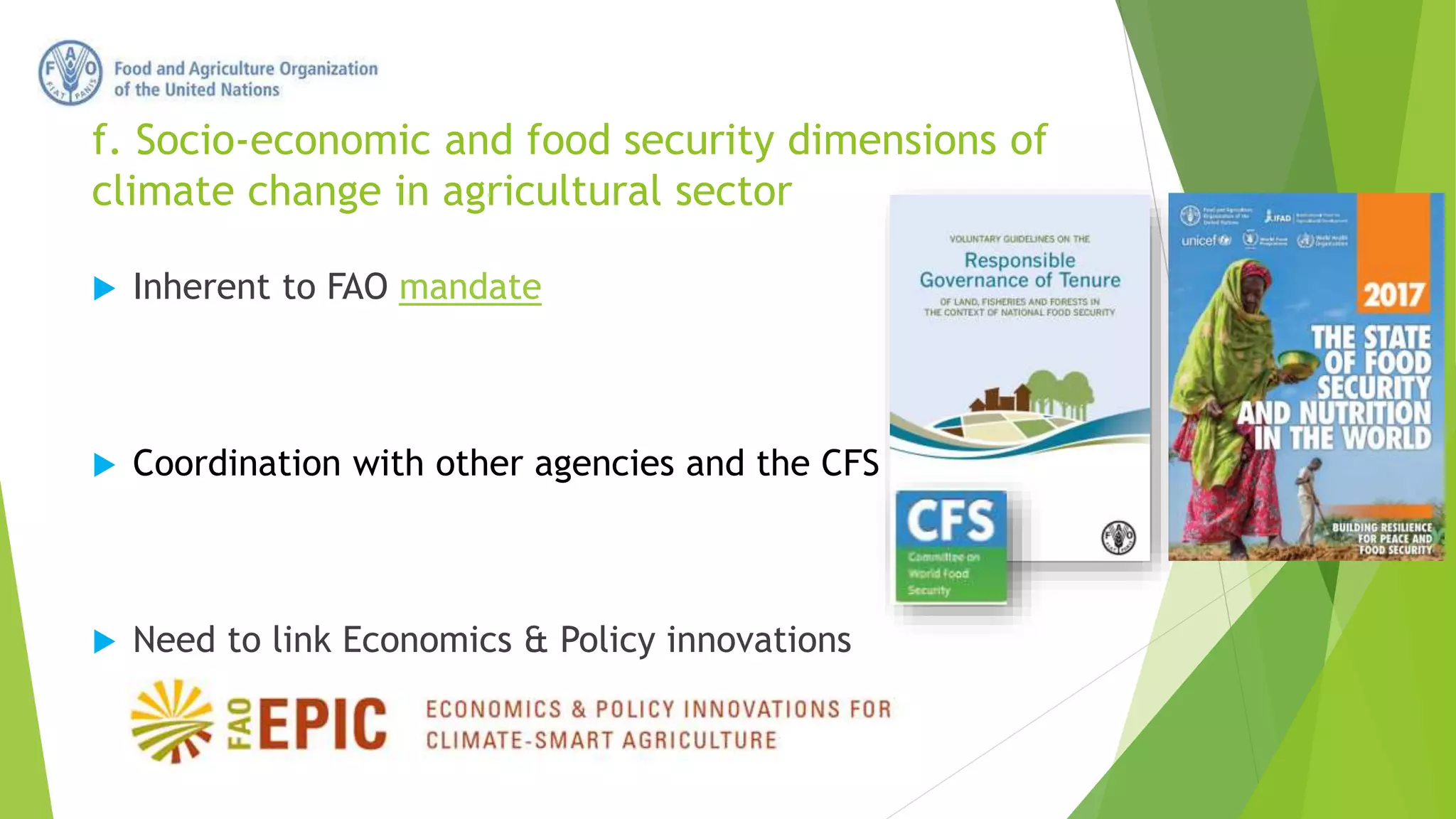 9. 9. f. Socio-economic and food security dimensions of climate change in agricultural sector  Inherent to FAO mandate  Coordination with other agencies and the CFS  Need to link Economics & Policy innovations