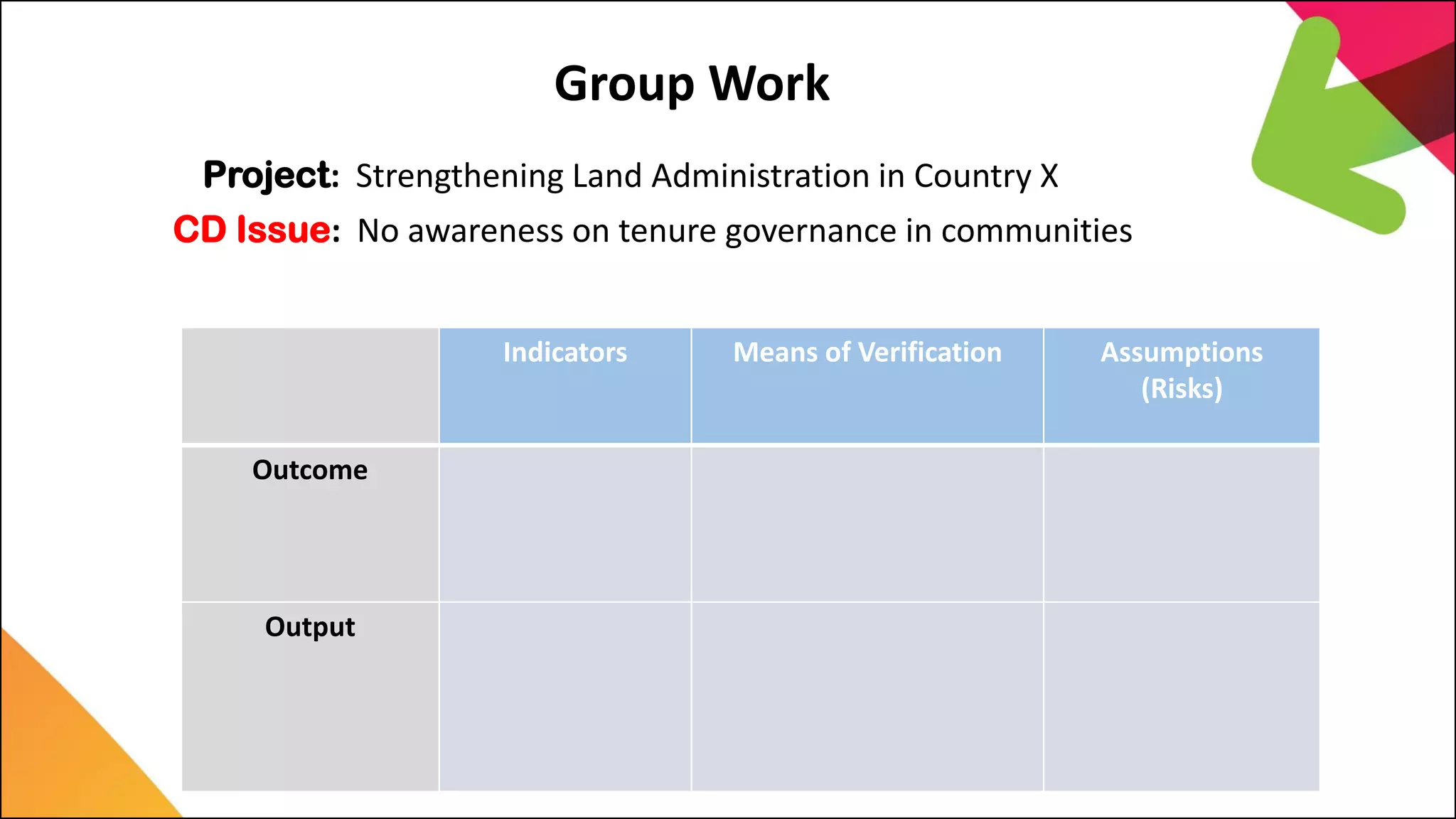 10. 10. 7th Capitalization Meeting EU Land Governance Programme Group Work Indicators Means of Verification Assumptions (Risks) Outcome Output Project: Strengthening Land Administration in Country X CD Issue: No awareness on tenure governance in communities