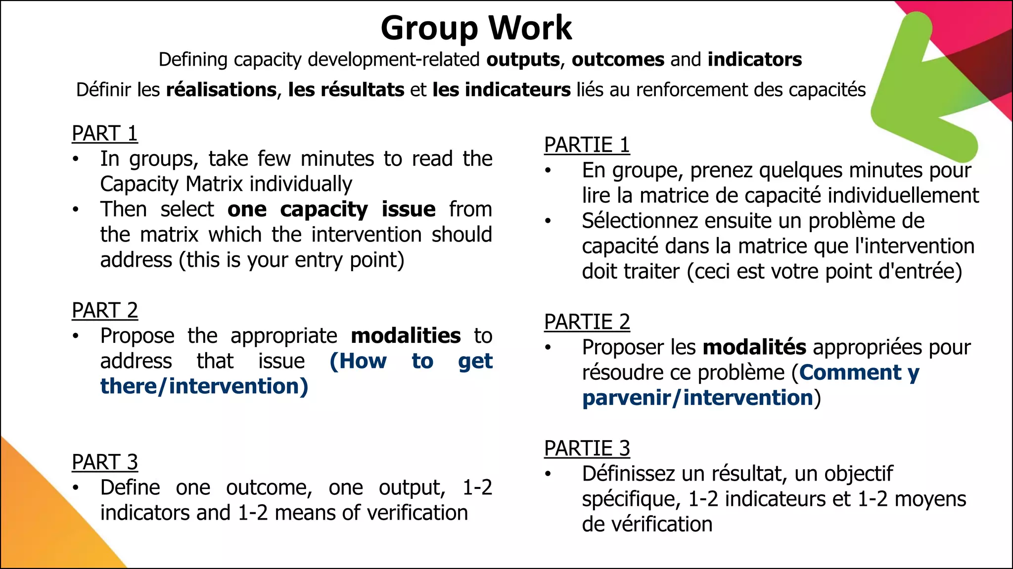 11. 11. 7th Capitalization Meeting EU Land Governance Programme Group Work PART 1 • In groups, take few minutes to read the Capacity Matrix individually • Then select one capacity issue from the matrix which the intervention should address (this is your entry point) PART 2 • Propose the appropriate modalities to address that issue (How to get there/intervention) PART 3 • Define one outcome, one output, 1-2 indicators and 1-2 means of verification Defining capacity development-related outputs, outcomes and indicators PARTIE 1 • En groupe, prenez quelques minutes pour lire la matrice de capacité individuellement • Sélectionnez ensuite un problème de capacité dans la matrice que l'intervention doit traiter (ceci est votre point d'entrée) PARTIE 2 • Proposer les modalités appropriées pour résoudre ce problème (Comment y parvenir/intervention) PARTIE 3 • Définissez un résultat, un objectif spécifique, 1-2 indicateurs et 1-2 moyens de vérification Définir les réalisations, les résultats et les indicateurs liés au renforcement des capacités