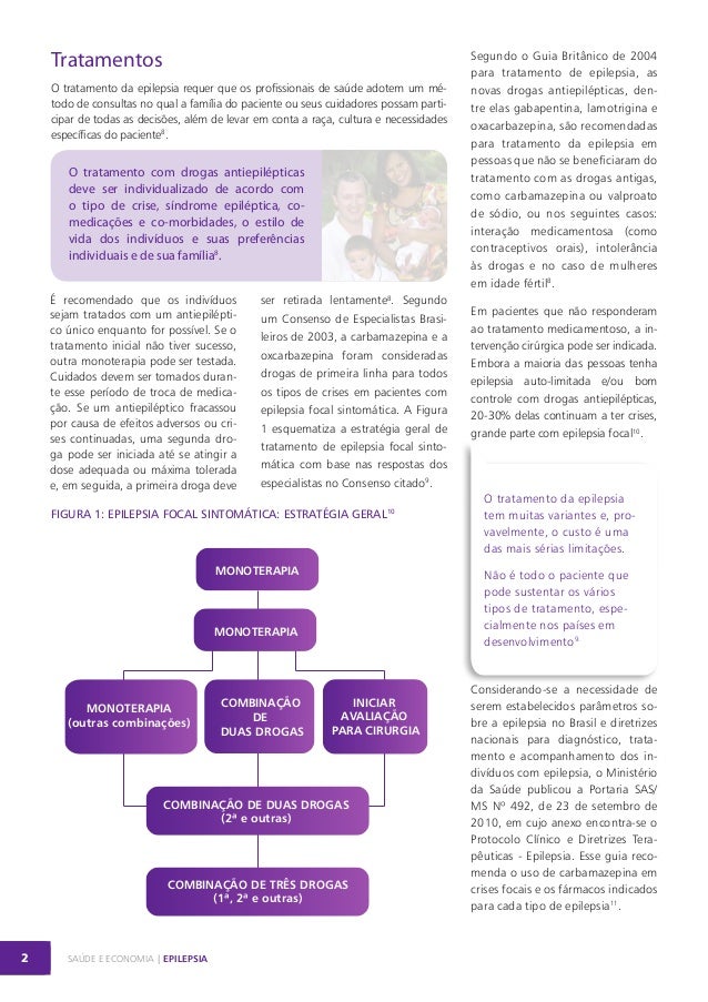2. 2. Tratamentos O tratamento da epilepsia requer que os profissionais de saúde adotem um método de consultas no qual a família do paciente ou seus cuidadores possam participar de todas as decisões, além de levar em conta a raça, cultura e necessidades específicas do paciente8. O tratamento com drogas antiepilépticas deve ser individualizado de acordo com o tipo de crise, síndrome epiléptica, comedicações e co-morbidades, o estilo de vida dos indivíduos e suas preferências individuais e de sua família8. É recomendado que os indivíduos sejam tratados com um antiepiléptico único enquanto for possível. Se o tratamento inicial não tiver sucesso, outra monoterapia pode ser testada. Cuidados devem ser tomados durante esse período de troca de medicação. Se um antiepiléptico fracassou por causa de efeitos adversos ou crises continuadas, uma segunda droga pode ser iniciada até se atingir a dose adequada ou máxima tolerada e, em seguida, a primeira droga deve ser retirada lentamente8. Segundo um Consenso de Especialistas Brasileiros de 2003, a carbamazepina e a oxcarbazepina foram consideradas drogas de primeira linha para todos os tipos de crises em pacientes com epilepsia focal sintomática. A Figura 1 esquematiza a estratégia geral de tratamento de epilepsia focal sintoespecialistas no Consenso citado9. MONOTERAPIA COMBINAÇÃO DE DUAS DROGAS INICIAR AVALIAÇÃO PARA CIRURGIA COMBINAÇÃO DE DUAS DROGAS (2ª e outras) COMBINAÇÃO DE TRÊS DROGAS (1ª, 2ª e outras) SAÚDE E ECONOMIA | EPILEPSIA O tratamento da epilepsia tem muitas variantes e, provavelmente, o custo é uma das mais sérias limitações. Não é todo o paciente que pode sustentar os vários tipos de tratamento, especialmente nos países em desenvolvimento 9. MONOTERAPIA 2 Em pacientes que não responderam ao tratamento medicamentoso, a intervenção cirúrgica pode ser indicada. Embora a maioria das pessoas tenha epilepsia auto-limitada e/ou bom controle com drogas antiepilépticas, 20-30% delas continuam a ter crises, grande parte com epilepsia focal10. mática com base nas respostas dos FIGURA 1: EPILEPSIA FOCAL SINTOMÁTICA: ESTRATÉGIA GERAL10 MONOTERAPIA (outras combinações) Segundo o Guia Britânico de 2004 para tratamento de epilepsia, as novas drogas antiepilépticas, dentre elas gabapentina, lamotrigina e oxacarbazepina, são recomendadas para tratamento da epilepsia em pessoas que não se beneficiaram do tratamento com as drogas antigas, como carbamazepina ou valproato de sódio, ou nos seguintes casos: interação medicamentosa (como contraceptivos orais), intolerância às drogas e no caso de mulheres em idade fértil8. Considerando-se a necessidade de serem estabelecidos parâmetros sobre a epilepsia no Brasil e diretrizes nacionais para diagnóstico, tratamento e acompanhamento dos indivíduos com epilepsia, o Ministério da Saúde publicou a Portaria SAS/ MS Nº 492, de 23 de setembro de 2010, em cujo anexo encontra-se o Protocolo Clínico e Diretrizes Terapêuticas - Epilepsia. Esse guia recomenda o uso de carbamazepina em crises focais e os fármacos indicados para cada tipo de epilepsia11.