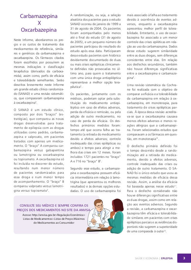 3. 3. Carbamazepina X Oxcarbazepina Neste Informe, abordaremos os preços e os custos de tratamento dos medicamentos de referência, similares e genéricos da carbamazepina e oxcarbazepina. Os fármacos citados foram escolhidos por possuírem as mesmas indicações e classificação terapêutica (derivados da carboxamida), assim como, perfis de eficácia e tolerabilidade semelhantes. Serão descritos brevemente neste Informe um grande estudo clínico randomizado (SANAD) e uma revisão sistemática, que compararam carbamazepina à oxcarbazepina3. O SANAD é um estudo clínico, composto por dois “braços” (estratégias), que comparou as novas drogas desenvolvidas para tratamento de epilepsia com as drogas utilizadas como padrão, carbamazepina e valproato, em pacientes tratados com apenas um medicamento. O “braço” A comparou carbamazepina versus gabapentina ou lamotrigina ou oxcarbazepina ou topiramato. A oxcarbazepina só foi incluída no decorrer do estudo, resultando num menor número de pacientes randomizados para essa droga e num menor tempo de acompanhamento. O “braço” B comparou valproato versus lamotrigina versus topiramato3. A randomização, ou seja, a seleção aleatória dos pacientes para o estudo SANAD ocorreu de janeiro de 1999 a 31 de agosto de 2004. Os pacientes foram acompanhados pelo menos até o final do estudo (31 de agosto de 2005), e um pequeno número de pacientes participou do resultado do estudo após essa data. Participaram desse estudo pacientes com histórico devidamente documentado de duas ou mais crises epilépticas clinicamente definidas não provocadas no último ano, para quem o tratamento com uma única droga antiepiléptica representava a melhor opção terapêutica3. Os pacientes, juntamente com os médicos, poderiam optar pela substituição do medicamento antiepiléptico em caso de efeitos adversos, perda da eficácia e remissão, ou pela adição de outro medicamento, no caso de perda da eficácia. Os desfechos primários medidos foram: tempo até que ocorra falha ao tratamento (a retirada do medicamento devido a efeitos adversos; controle inadequado das crises epilépticas ou ambos) e tempo para atingir a melhora das crises em 12 meses. Foram incluídos 1721 pacientes no “braço” A e 716 no “braço” B3. Segundo esse estudo, a carbamazepina e oxcarbazepina possuem eficácia intermediária em relação à lamotrigina (que apresentou os melhores resultados) e às demais opções estudadas. O uso de carbamazepina foi CONSULTE SEU MÉDICO E SEMPRE CONFIRA OS PREÇOS DOS MEDICAMENTOS NO SITE DA ANVISA. Acesse: http://anvisa.gov.br>Regulação Econômica> Listas de Medicamentos> Listas de Preços Máximos de Medicamentos ao Consumidor mais associado à falha ao tratamento devido à ocorrência de eventos adversos, enquanto a oxcarbazepina apresentou melhor perfil de tolerabilidade. Entretanto, o uso de oxcarbazepina foi associado a um menor controle das crises epiléticas em relação ao uso da carbamazepina. Dados desse estudo sugerem similaridade entre as duas drogas, sem diferenças consistentes entre elas. Em relação aos desfechos secundários, também não houve diferenças significativas entre a oxcarbazepina e carbamazepina3. Uma revisão sistemática da Cochrane foi realizada com o objetivo de comparar a eficácia e a tolerabilidade da carbamazepina em relação à oxcarbazepina, em monoterapia, para tratamento de crises epilépticas parciais. À época dessa revisão acreditava-se que a oxcarbazepina causava menos efeitos adversos e menos reações alérgicas que a carbamazepina. Foram selecionados estudos que comparavam a os fármacos em questão, em monoterapia12. O desfecho primário definido foi o tempo decorrido desde a randomização até a retirada do medicamento, devido a efeitos adversos, controle inadequado das crises ou adição de outro tratamento. O SANAD foi o único estudo que usou as mesmas medidas de eficácia dessa revisão. Assim, a análise da eficácia foi baseada apenas nesse estudo11. Para o desfecho considerado não houve diferenças significativas entre as duas drogas, assim como em relação aos eventos adversos. Segundo a revisão, a carbamazepina e oxcarbazepina têm eficácia e tolerabilidade similares em pacientes com crises epilépticas parciais e as evidências disponíveis não sugerem a superioridade de uma comparada à outra12. SAÚDE E ECONOMIA | EPILEPSIA 3