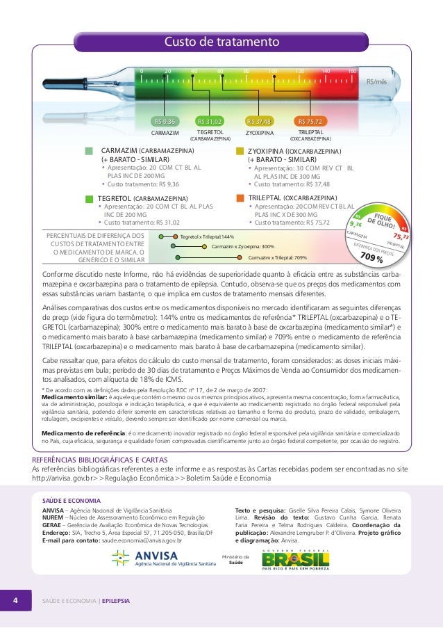 4. 4. Custo de tratamento 0 20 40 60 80 100 120 140 160 R$/mês R$ 9,36 R$ 31,02 CARMAZIM TEGRETOL R$ 37,48 (CARBAMAZEPINA) CARMAZIM (CARBAMAZEPINA) (+ BARATO - SIMILAR) ZYOXIPINA (OXCARBAZEPINA) ZYOXIPINA ((OXCARBAZEPINA) (+ BARATO - SIMILAR) • Apresentação: 30 COM REV CT BL AL PLAS INC DE 300 MG • Custo tratamento: R$ 37,48 • Apresentação: 20 COM CT BL AL PLAS INC DE 200 MG • Custo tratamento: R$ 9,36 TRILEPTAL (OXCARBAZEPINA) • Apresentação: 20 COM REV CT BL AL PLAS INC X DE 300 MG • Custo tratamento: R$ 75,72 9,36 TEGRETOL (CARBAMAZEPINA) • Apresentação: 20 COM CT BL AL PLAS INC DE 200 MG • Custo tratamento: R$ 31,02 PERCENTUAIS DE DIFERENÇA DOS CUSTOS DE TRATAMENTO ENTRE O MEDICAMENTO DE MARCA, O GENÉRICO E O SIMILAR R$ 75,72 TRILEPTAL CAR MAZ Tegretol x Trileptal:144% Carmazim x Zyoxipina: 300% Carmazim x Trileptal: 709% IM 75,72 TRIL EPTA 709 L Conforme discutido neste Informe, não há evidências de superioridade quanto à eficácia entre as substâncias carbamazepina e oxcarbazepina para o tratamento de epilepsia. Contudo, observa-se que os preços dos medicamentos com essas substâncias variam bastante, o que implica em custos de tratamento mensais diferentes. Análises comparativas dos custos entre os medicamentos disponíveis no mercado identificaram as seguintes diferenças de preço (vide figura do termômetro): 144% entre os medicamentos de referência* TRILEPTAL (oxcarbazepina) e o TEGRETOL (carbamazepina); 300% entre o medicamento mais barato à base de oxcarbazepina (medicamento similar*) e o medicamento mais barato à base carbamazepina (medicamento similar) e 709% entre o medicamento de referência TRILEPTAL (oxcarbazepina) e o medicamento mais barato à base de carbamazepina (medicamento similar). Cabe ressaltar que, para efeitos do cálculo do custo mensal de tratamento, foram considerados: as doses iniciais máximas previstas em bula; período de 30 dias de tratamento e Preços Máximos de Venda ao Consumidor dos medicamentos analisados, com alíquota de 18% de ICMS. * De acordo com as definições dadas pela Resolução RDC nº 17, de 2 de março de 2007: Medicamento similar: é aquele que contém o mesmo ou os mesmos princípios ativos, apresenta mesma concentração, forma farmacêutica, via de administração, posologia e indicação terapêutica, e que é equivalente ao medicamento registrado no órgão federal responsável pela vigilância sanitária, podendo diferir somente em características relativas ao tamanho e forma do produto, prazo de validade, embalagem, rotulagem, excipientes e veículo, devendo sempre ser identificado por nome comercial ou marca. Medicamento de referência: é o medicamento inovador registrado no órgão federal responsável pela vigilância sanitária e comercializado no País, cuja eficácia, segurança e qualidade foram comprovadas cientificamente junto ao órgão federal competente, por ocasião do registro. REFERÊNCIAS BIBLIOGRÁFICAS E CARTAS As referências bibliográficas referentes a este informe e as respostas às Cartas recebidas podem ser encontradas no site http://anvisa.gov.br>>Regulação Econômica>>Boletim Saúde e Economia SAÚDE E ECONOMIA ANVISA – Agência Nacional de Vigilância Sanitária NUREM – Núcleo de Assessoramento Econômico em Regulação GERAE – Gerência de Avaliação Econômica de Novas Tecnologias Endereço: SIA, Trecho 5, Área Especial 57, 71.205-050, Brasília/DF E-mail para contato: saude.economia@anvisa.gov.br Texto e pesquisa: Giselle Silva Pereira Calais, Symone Oliveira Lima. Revisão do texto: Gustavo Cunha Garcia, Renata Faria Pereira e Telma Rodrigues Caldeira. Coordenação da publicação: Alexandre Lemgruber P. d’Oliveira. Projeto gráfico e diagramação: Anvisa. Ministério da Saúde 4 SAÚDE E ECONOMIA | EPILEPSIA
