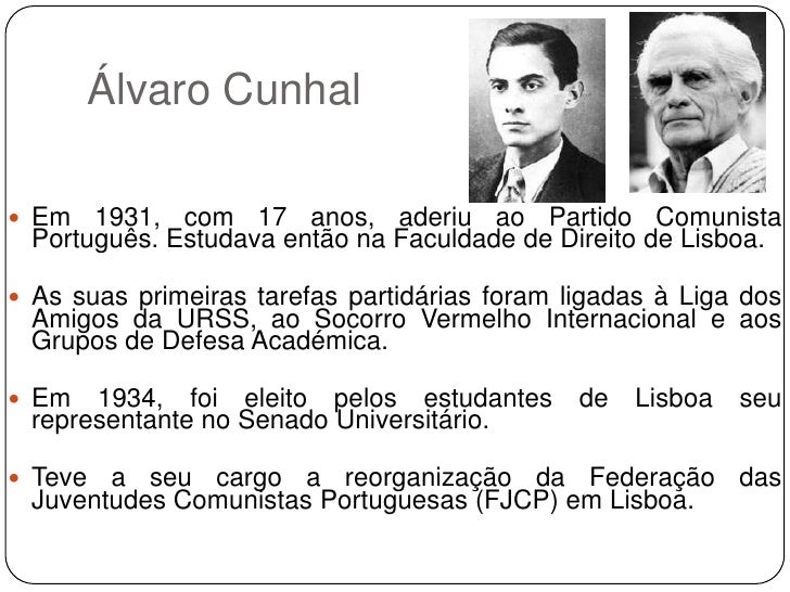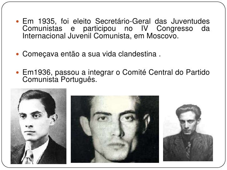 16. 16. Teve a seu cargo a reorganização da Federação das Juventudes Comunistas Portuguesas (FJCP) em Lisboa.</li></li></ul><li>Em 1935, foi eleito Secretário-Geral das Juventudes Comunistas e participou no IV Congresso da Internacional Juvenil Comunista, em Moscovo. <br />Começava então a sua vida clandestina .<br />Em1936, passou a integrar o Comité Central do Partido Comunista Português.<br />