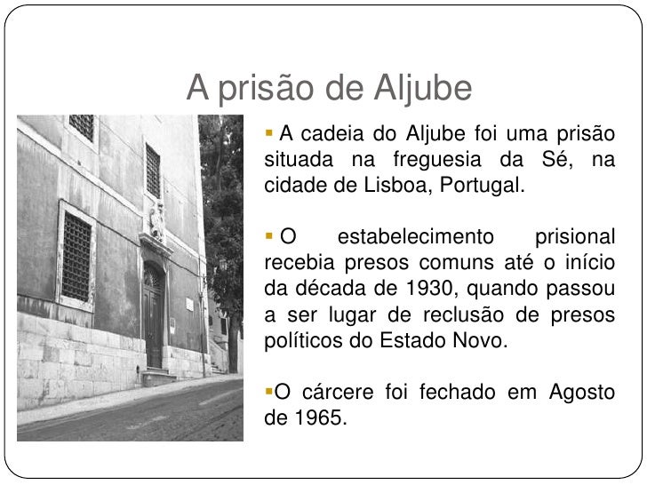 21. 21. O cárcere foi fechado em Agosto de 1965.</li></li></ul><li>Presos do Aljube <br />Urbano Tavares Rodrigues<br />António Borges Coelho<br />Miguel Torga<br />José Manuel Tengarrinha<br />