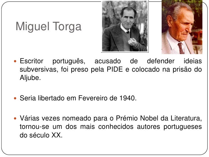 23. 23. MiguelTorga<br />Escritor português, acusado de defender ideias subversivas, foi preso pela PIDE e colocado na prisão do Aljube. <br />Seria libertado em Fevereiro de 1940.<br />Várias vezes nomeado para o Prémio Nobel da Literatura, tornou-se um dos mais conhecidos autores portugueses do século XX. <br />