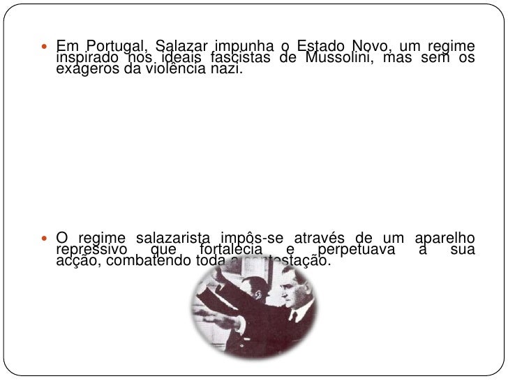 2. 2. <ul><li>Em Portugal, Salazar impunha o Estado Novo, um regime inspirado nos ideais fascistas de Mussolini, mas sem os exageros da violência nazi.