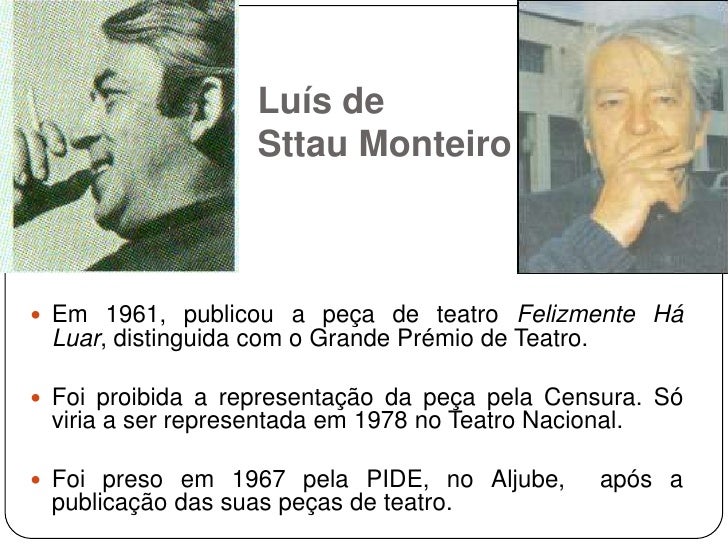 24. 24. Luís de <br />Sttau Monteiro<br />Em 1961, publicou a peça de teatro Felizmente Há Luar, distinguida com o Grande Prémio de Teatro.<br />Foi proibida a representação da peça pela Censura. Só viria a ser representada em 1978 no Teatro Nacional. <br />Foi preso em 1967 pela PIDE, no Aljube, após a publicação das suas peças de teatro.<br />