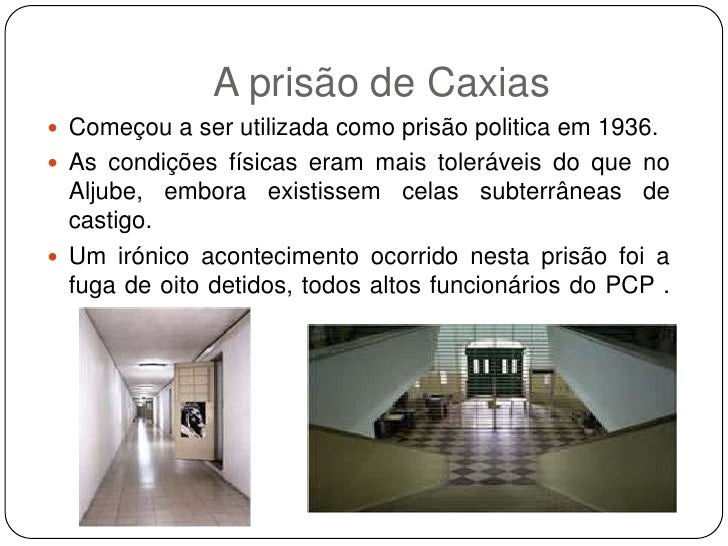 26. 26. A prisão de Caxias<br />Começou a ser utilizada como prisão politica em 1936.<br />As condições físicas eram mais toleráveis do que no Aljube, embora existissem celas subterrâneas de castigo. <br />Um irónico acontecimento ocorrido nesta prisão foi a fuga de oito detidos, todos altos funcionários do PCP .<br />
