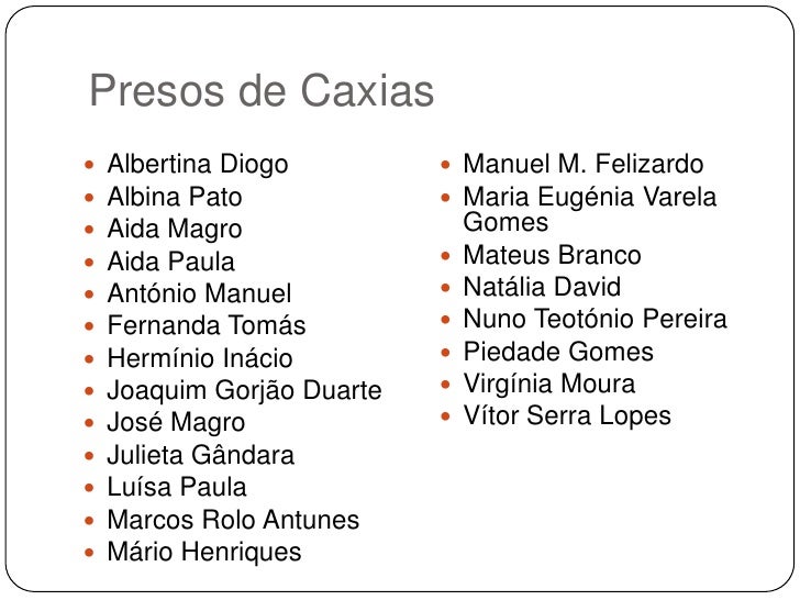 27. 27. Presos de Caxias<br />Albertina Diogo<br />Albina Pato<br />Aida Magro<br />Aida Paula<br />António Manuel<br />Fernanda Tomás<br />Hermínio Inácio<br />Joaquim Gorjão Duarte<br />José Magro<br />Julieta Gândara<br />Luísa Paula<br />Marcos Rolo Antunes<br />Mário Henriques<br />Manuel M. Felizardo<br />Maria Eugénia Varela Gomes<br />Mateus Branco<br />Natália David<br />Nuno Teotónio Pereira<br />Piedade Gomes<br />Virgínia Moura<br />Vítor Serra Lopes<br />