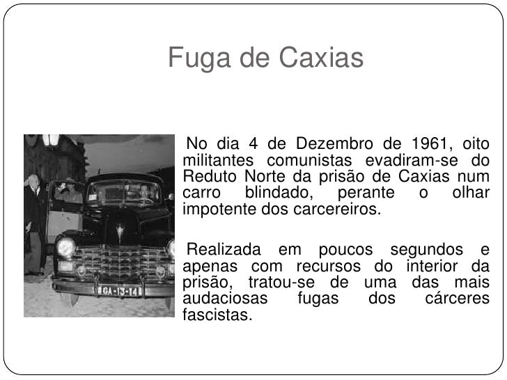 29. 29. Fuga de Caxias <br /> No dia 4 de Dezembro de 1961, oito militantes comunistas evadiram-se do Reduto Norte da prisão de Caxias num carro blindado, perante o olhar impotente dos carcereiros. <br /> Realizada em poucos segundos e apenas com recursos do interior da prisão, tratou-se de uma das mais audaciosas fugas dos cárceres fascistas.<br />