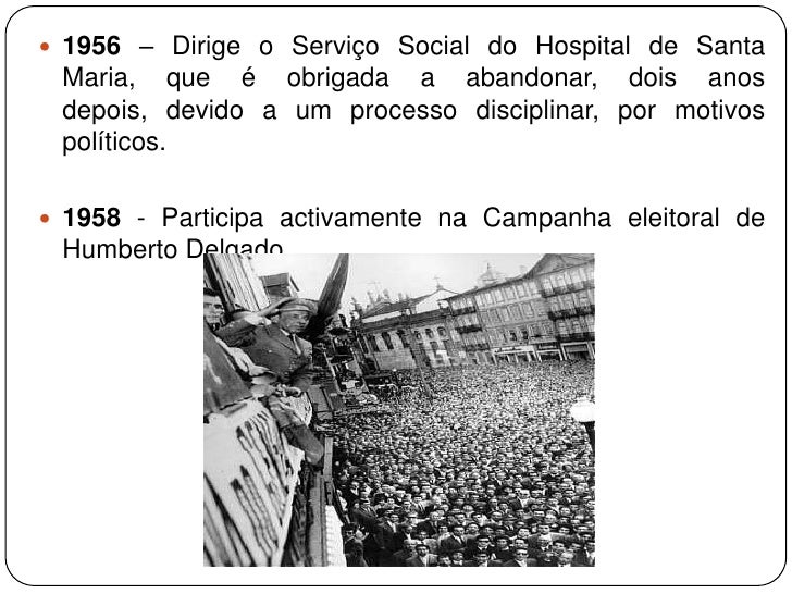 33. 33. 1956 – Dirige o Serviço Social do Hospital de Santa Maria, que é obrigada a abandonar, dois anos depois, devido a um processo disciplinar, por motivos políticos.<br />1958 - Participa activamente na Campanha eleitoral de Humberto Delgado.<br />