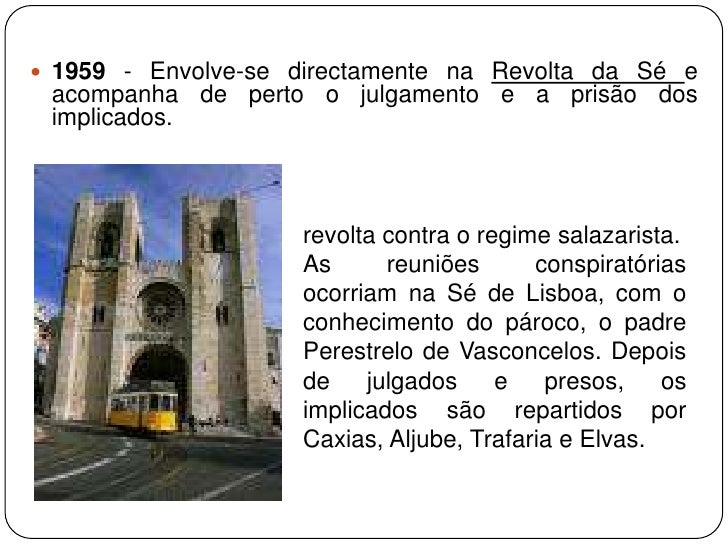 34. 34. 1959 - Envolve-se directamente na Revolta da Sé e acompanha de perto o julgamento e a prisão dos implicados.<br />revolta contra o regime salazarista.<br />As reuniões conspiratórias ocorriam na Sé de Lisboa, com o conhecimento do pároco, o padre Perestrelo de Vasconcelos. Depois de julgados e presos, os implicados são repartidos por Caxias, Aljube, Trafaria e Elvas.<br />