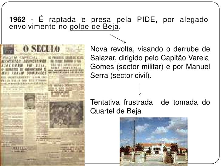 35. 35. 1962 - É raptada e presa pela PIDE, por alegado envolvimento no golpe de Beja. <br />Nova revolta, visando o derrube de Salazar, dirigido pelo Capitão Varela<br />Gomes (sector militar) e por Manuel Serra (sector civil).<br />Tentativa frustrada de tomada do Quartel de Beja<br />