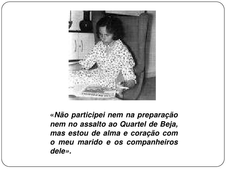 38. 38. «Não participei nem na preparação nem no assalto ao Quartel de Beja, mas estou de alma e coração com o meu marido e os companheiros dele». <br />