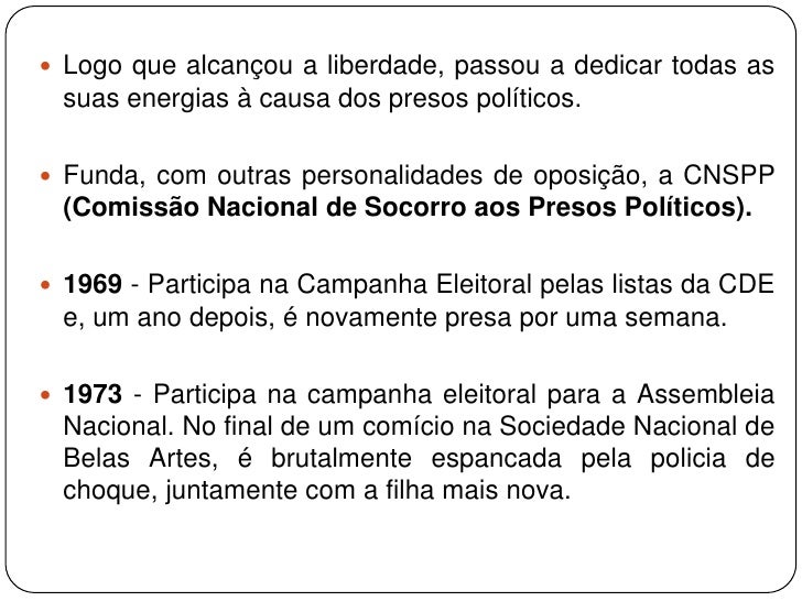 39. 39. Logo que alcançou a liberdade, passou a dedicar todas as suas energias à causa dos presos políticos. <br />Funda, com outras personalidades de oposição, a CNSPP (Comissão Nacional de Socorro aos Presos Políticos).<br />1969 - Participa na Campanha Eleitoral pelas listas da CDE e, um ano depois, é novamente presa por uma semana.<br />1973 - Participa na campanha eleitoral para a Assembleia Nacional. No final de um comício na Sociedade Nacional de Belas Artes, é brutalmente espancada pela policia de choque, juntamente com a filha mais nova.<br />