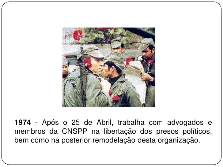 40. 40. 1974 - Após o 25 de Abril, trabalha com advogados e membros da CNSPP na libertação dos presos políticos, bem como na posterior remodelação desta organização.<br />