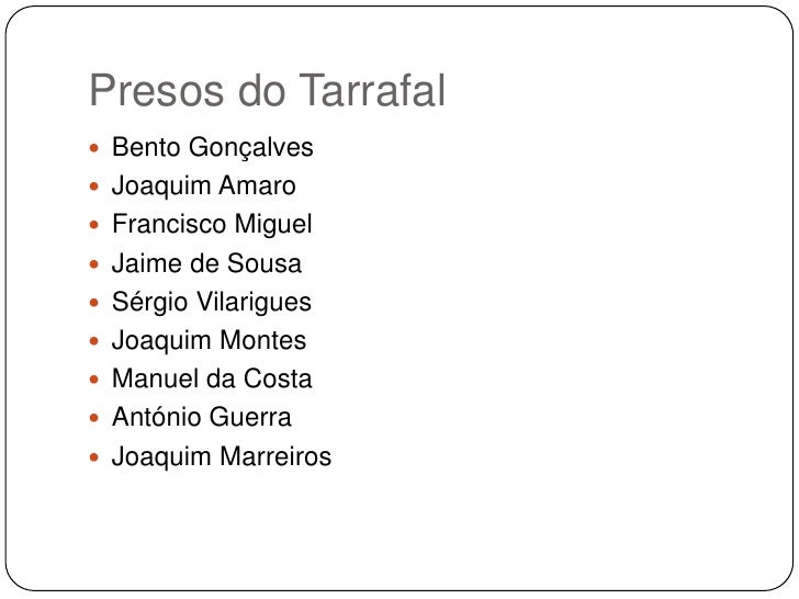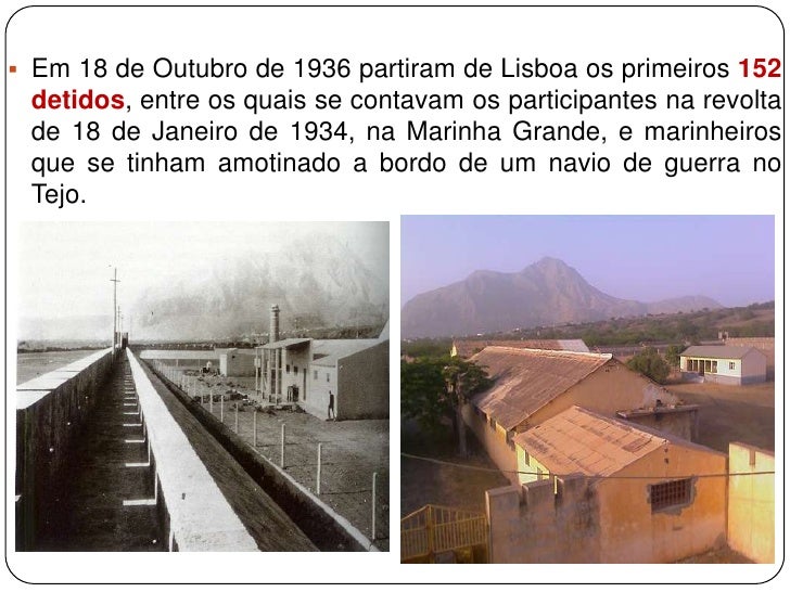 45. 45. <ul><li>Em 18 de Outubro de 1936 partiram de Lisboa os primeiros 152 detidos, entre os quais se contavam os participantes na revolta de 18 de Janeiro de 1934, na Marinha Grande, e marinheiros que se tinham amotinado a bordo de um navio de guerra no Tejo.</li></li></ul><li><ul><li>O Campo do Tarrafal ou Campo de Concentração do Tarrafal, como ficou conhecido, começou a funcionar em 29 de Outubro de 1936, com a chegada dos primeiros prisioneiros.</li></ul>Grupo de prisioneiros do Tarrafal<br />