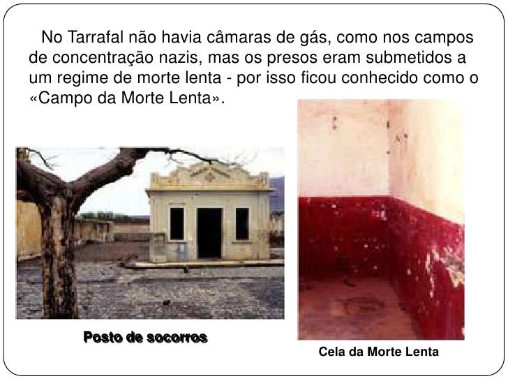 47. 47. <ul><li> No Tarrafal não havia câmaras de gás, como nos campos de concentração nazis, mas os presos eram submetidos a um regime de morte lenta - por isso ficou conhecido como o «Campo da Morte Lenta». </li></ul>Posto de socorros<br />Cela da Morte Lenta<br />