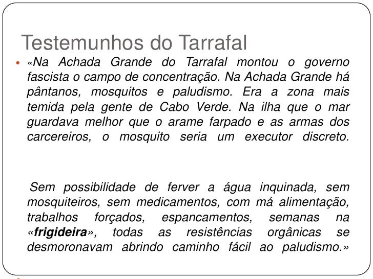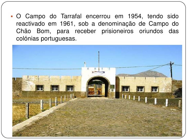 49. 49. <ul><li>O Campo do Tarrafal encerrou em 1954, tendo sido reactivado em 1961, sob a denominação de Campo do Chão Bom, para receber prisioneiros oriundos das colónias portuguesas.</li></li></ul><li>Testemunhos do Tarrafal<br />«Na Achada Grande do Tarrafal montou o governo fascista o campo de concentração. Na Achada Grande há pântanos, mosquitos e paludismo. Era a zona mais temida pela gente de Cabo Verde. Na ilha que o mar guardava melhor que o arame farpado e as armas dos carcereiros, o mosquito seria um executor discreto. <br /> Sem possibilidade de ferver a água inquinada, sem mosquiteiros, sem medicamentos, com má alimentação, trabalhos forçados, espancamentos, semanas na «frigideira», todas as resistências orgânicas se desmoronavam abrindo caminho fácil ao paludismo.»<br />