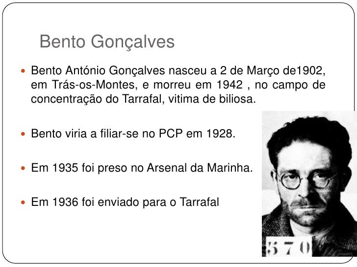 53. 53. Bento Gonçalves <br />Bento António Gonçalves nasceu a 2 de Março de1902, em Trás-os-Montes, e morreu em 1942 , no campo de concentração do Tarrafal, vitima de biliosa.<br />Bento viria a filiar-se no PCP em 1928.<br />Em 1935 foi preso no Arsenal da Marinha.<br />Em 1936 foi enviado para o Tarrafal<br />