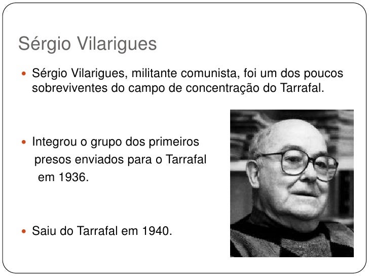 54. 54. Sérgio Vilarigues<br />Sérgio Vilarigues, militante comunista, foi um dos poucos sobreviventes do campo de concentração do Tarrafal. <br />Integrou o grupo dos primeiros <br /> presos enviados para o Tarrafal <br /> em 1936.<br />Saiu do Tarrafal em 1940.<br />