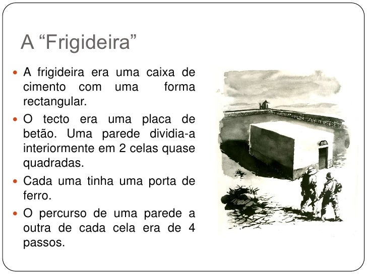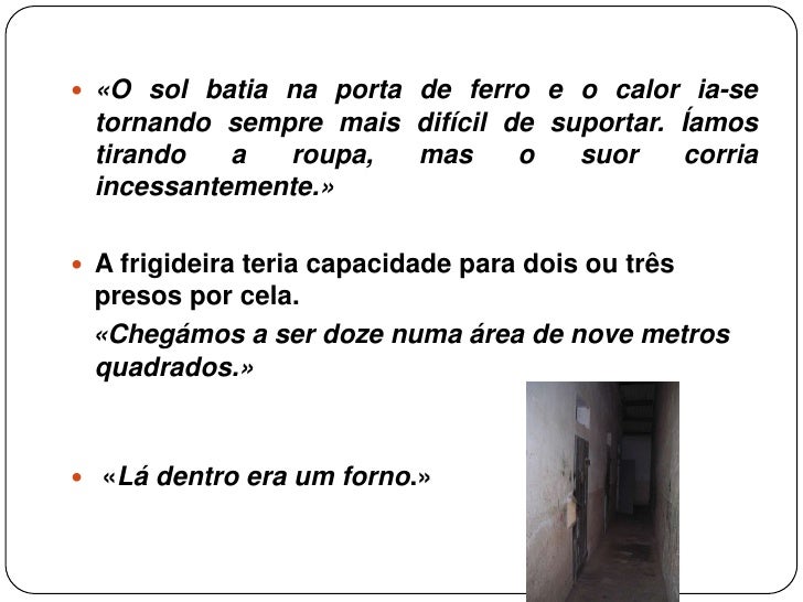 57. 57. «O sol batia na porta de ferro e o calor ia-se tornando sempre mais difícil de suportar. Íamos tirando a roupa, mas o suor corria incessantemente.» <br />A frigideira teria capacidade para dois ou três presos por cela. <br /> «Chegámos a ser doze numa área de nove metros quadrados.»<br /> «Lá dentro era um forno.»<br />