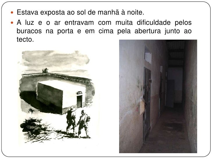 56. 56. Estava exposta ao sol de manhã à noite. <br />A luz e o ar entravam com muita dificuldade pelos buracos na porta e em cima pela abertura junto ao tecto. <br />
