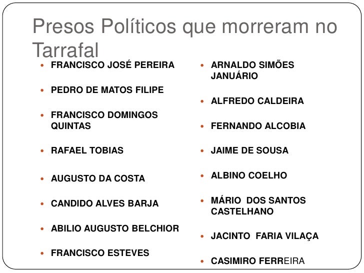 58. 58. Presos Políticos que morreram no Tarrafal<br />FRANCISCO JOSÉ PEREIRA<br />PEDRO DE MATOS FILIPE<br />FRANCISCO DOMINGOS QUINTAS<br />RAFAEL TOBIAS <br />AUGUSTO DA COSTA<br />CANDIDO ALVES BARJA<br />ABILIO AUGUSTO BELCHIOR<br />FRANCISCO ESTEVES<br />ARNALDO SIMÕES JANUÁRIO<br />ALFREDO CALDEIRA<br />FERNANDO ALCOBIA<br />JAIME DE SOUSA<br />ALBINO COELHO<br />MÁRIO  DOS SANTOS CASTELHANO<br />JACINTO  FARIA VILAÇA<br />CASIMIRO FERREIRA<br />