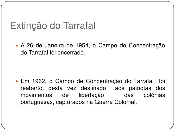 60. 60. Extinção do Tarrafal<br />A 26 de Janeiro de 1954, o Campo de Concentração do Tarrafal foi encerrado.<br />Em 1962, o Campo de Concentração do Tarrafal foi reaberto, desta vez destinado aos patriotas dos movimentos de libertação das colónias portuguesas, capturados na Guerra Colonial.<br />