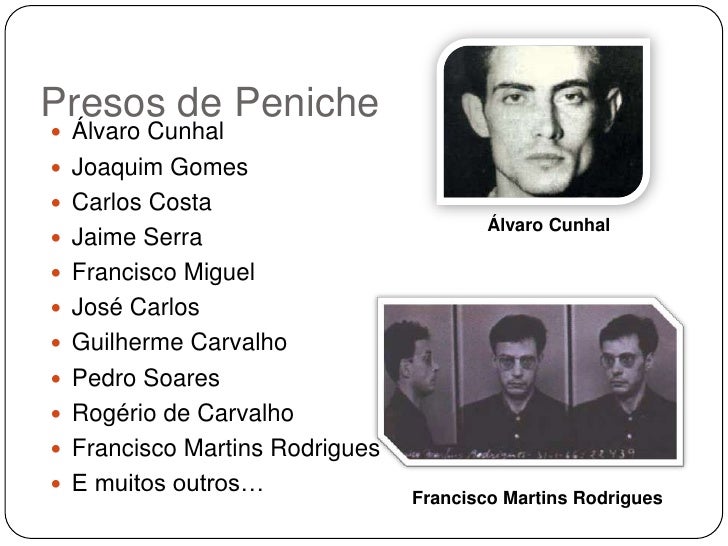 7. 7. Presos de Peniche<br />Álvaro Cunhal<br />Joaquim Gomes <br />Carlos Costa <br />Jaime Serra<br />Francisco Miguel<br />José Carlos<br />Guilherme Carvalho<br />Pedro Soares<br />Rogério de Carvalho <br />Francisco Martins Rodrigues<br />E muitos outros…<br />Álvaro Cunhal<br />Francisco Martins Rodrigues<br />