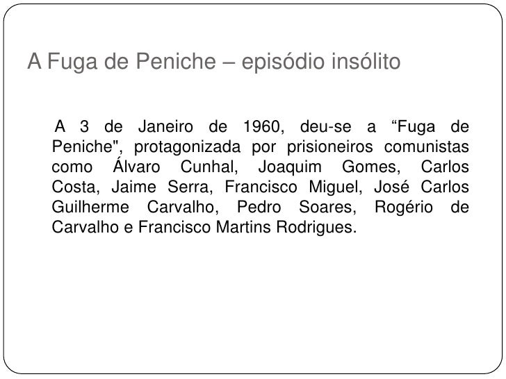 8. 8. A Fuga de Peniche – episódio insólito<br /> A 3 de Janeiro de 1960, deu-se a “Fuga de Peniche", protagonizada por prisioneiros comunistas como Álvaro Cunhal, Joaquim Gomes, Carlos Costa, Jaime Serra, Francisco Miguel, José Carlos Guilherme Carvalho, Pedro Soares, Rogério de Carvalho e Francisco Martins Rodrigues.<br />