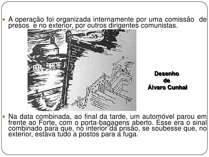 10. 10. Na data combinada, ao final da tarde, um automóvel parou em frente ao Forte, com o porta-bagagens aberto. Esse era o sinal combinado para que, no interior da prisão, se soubesse que, no exterior, estava tudo a postos para a fuga. </li></ul>Desenho <br />de <br />Álvaro Cunhal<br />
